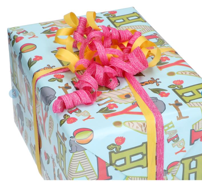 Innpakningspapir Happy Turkisblå er et papir med turkisblå bakgrunn og teksten "Happy" sammen med dyremotiver. Kompletter med lignende farger på gavebåndet for å oppnå fine innpakninger av gaver og presanger som passer til de yngre.