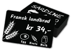Du kan selv lage elegante plastkort som vist her for merking av matvarer med allergener etter Mattilsynets krav.